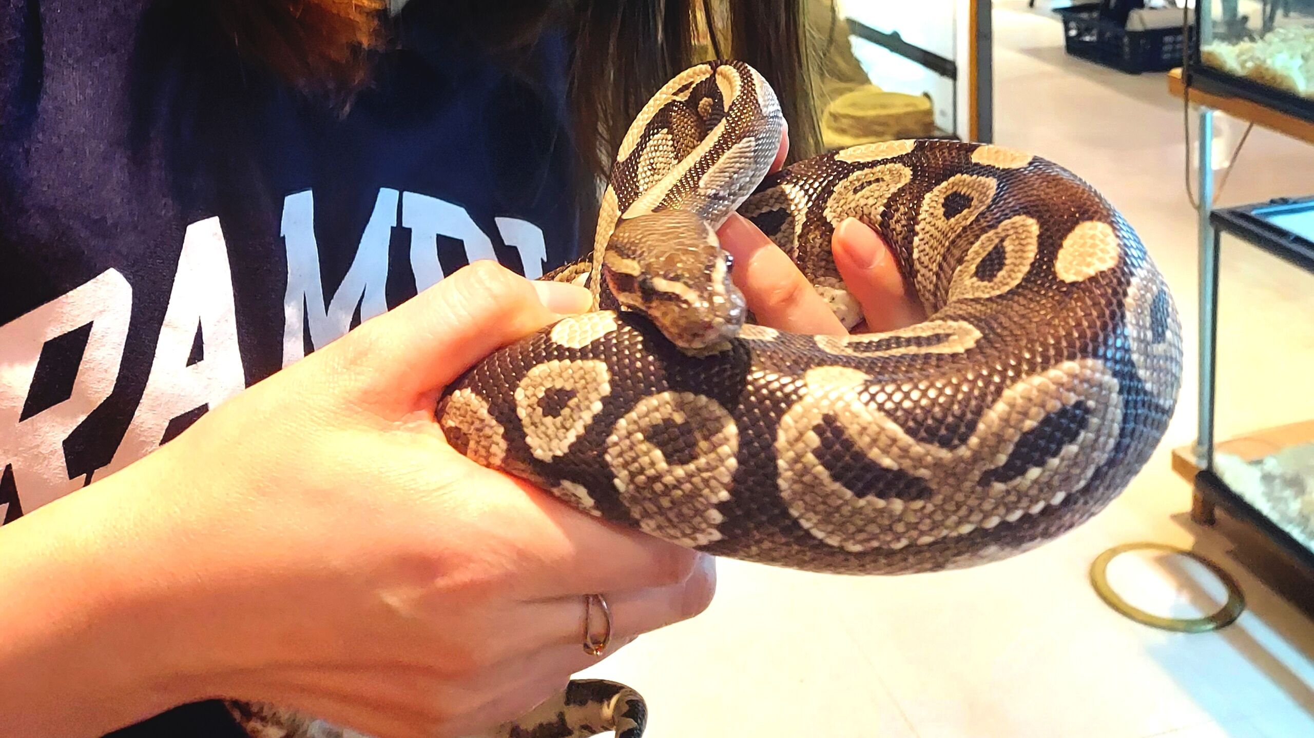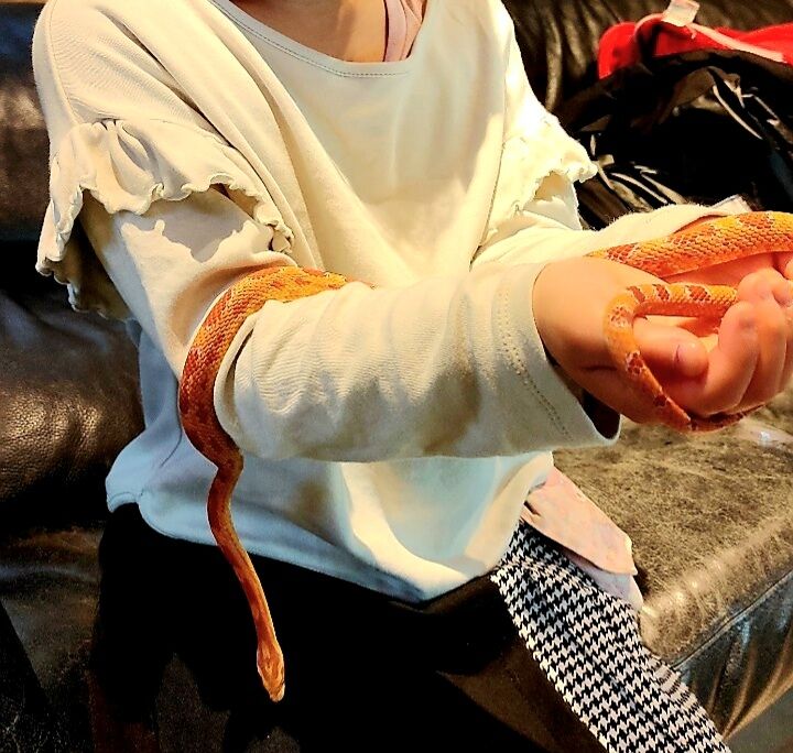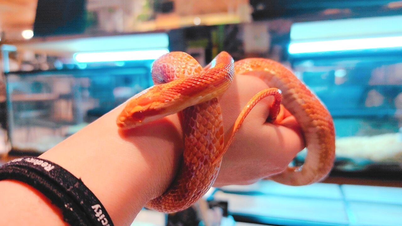 定員さんに子供でも触りやすい種類を聞くと、コーンスネークがいいよと言われコーンスネークのあんずちゃんにチャレンジ❣️