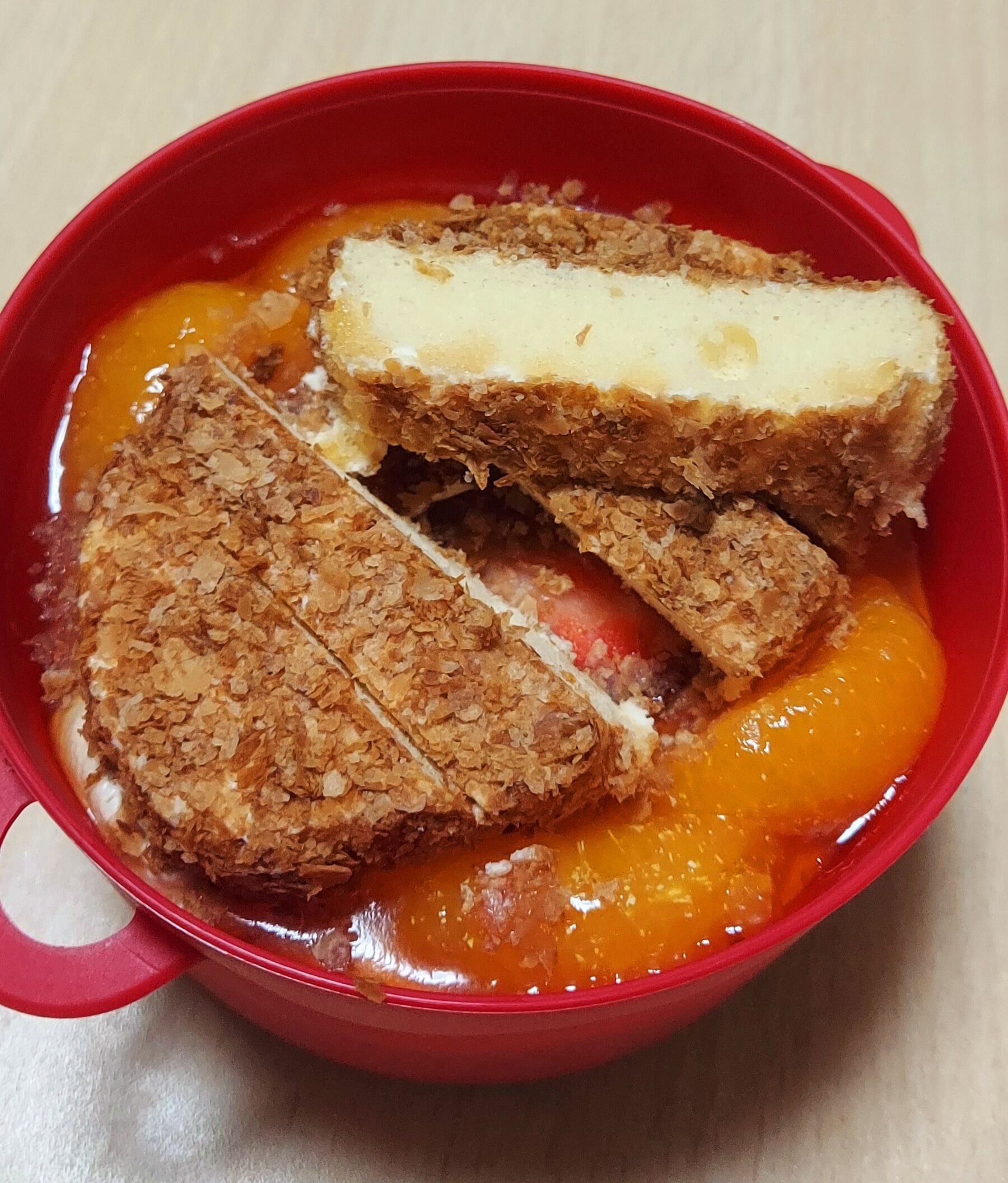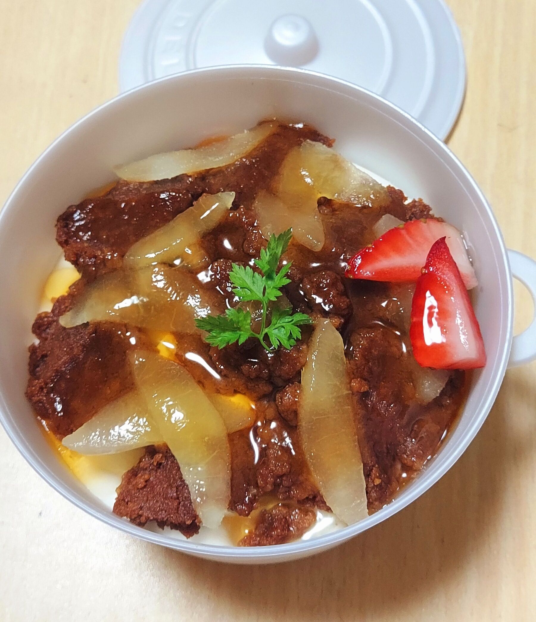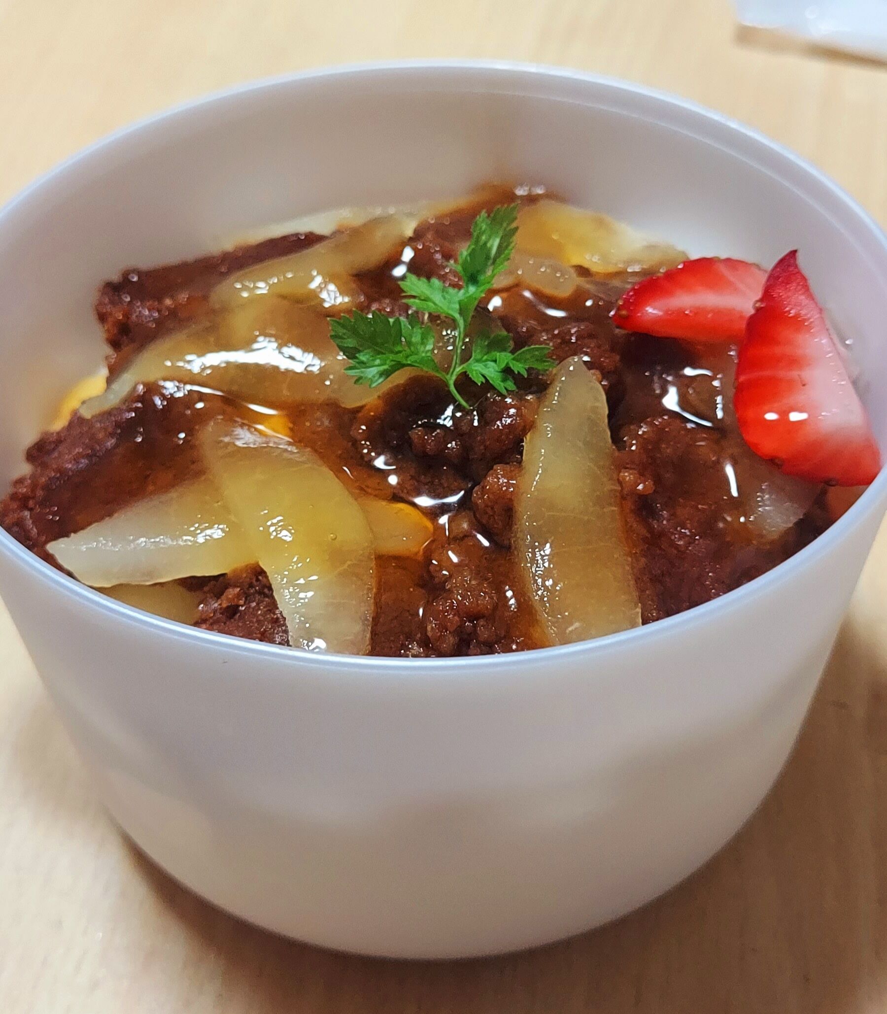 カツ丼プリンスポンジにパイ生地が付いてて、食べる時もカツ丼ぽい🤤